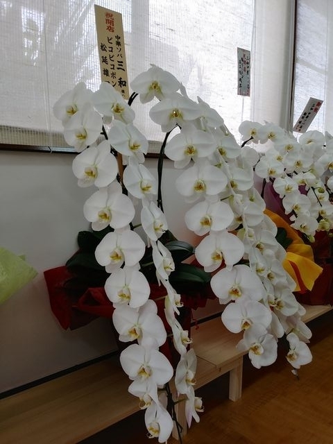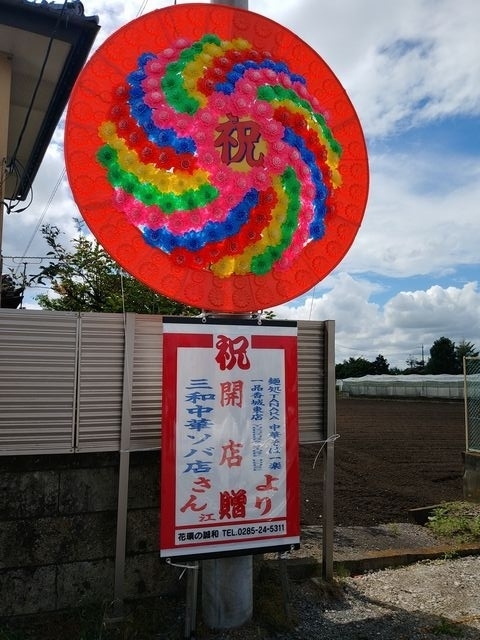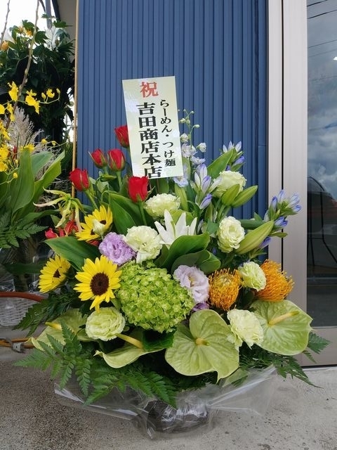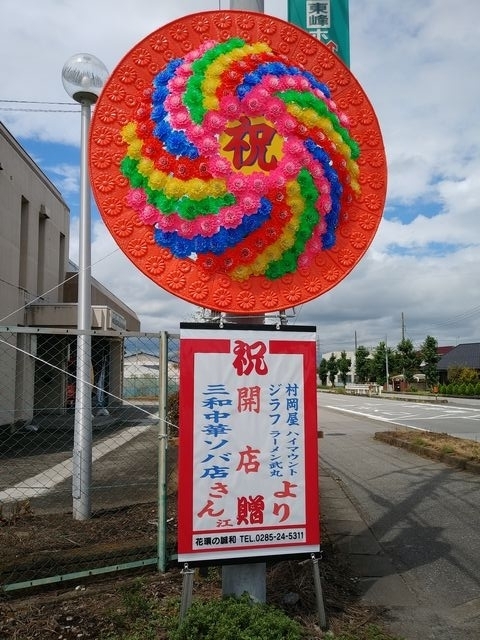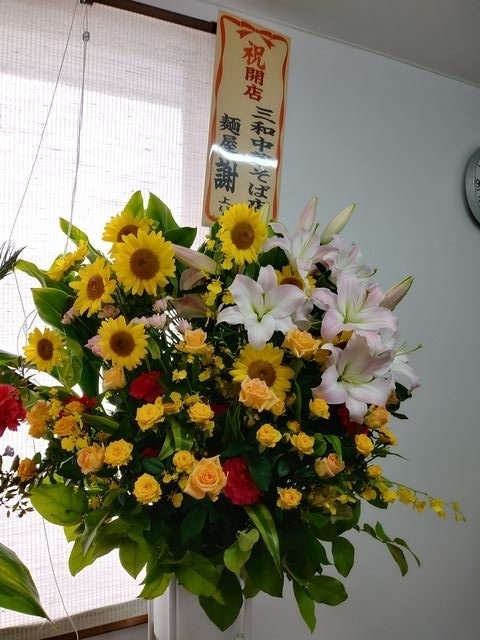 栃木県栃木市の『めんや天夢』に『中華ソバ伊吹』の常連のお客さんからの連盟のフラワースタンドもあった。