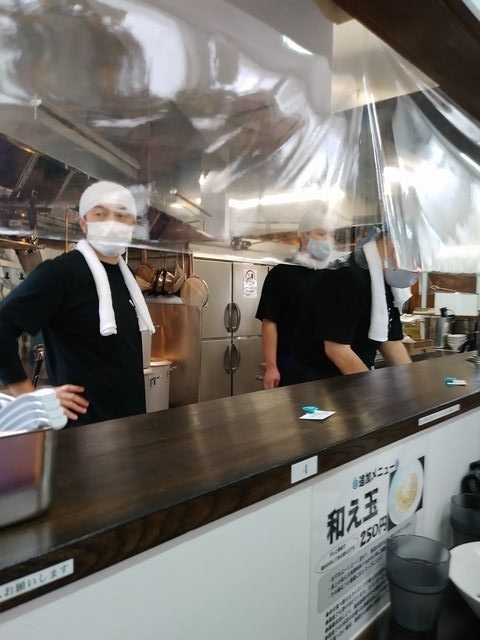 新コロナウィルス感染症対策のために飛散防止のためのビニールのカーテンが掛かるオープンキッチンの厨房には、荒井店主に三村店主、聖也さんの3人!