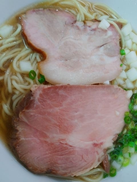 豚肩ロース肉のレアチャーシューにスモークチャーシュー、玉ねぎ、小ネギ、海苔と味玉がトッピングされた!