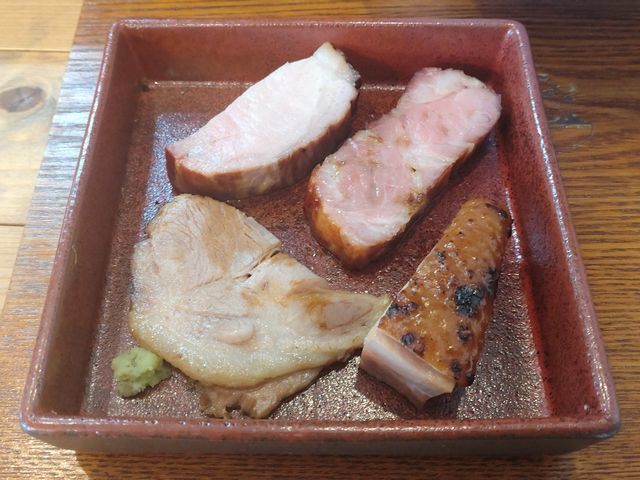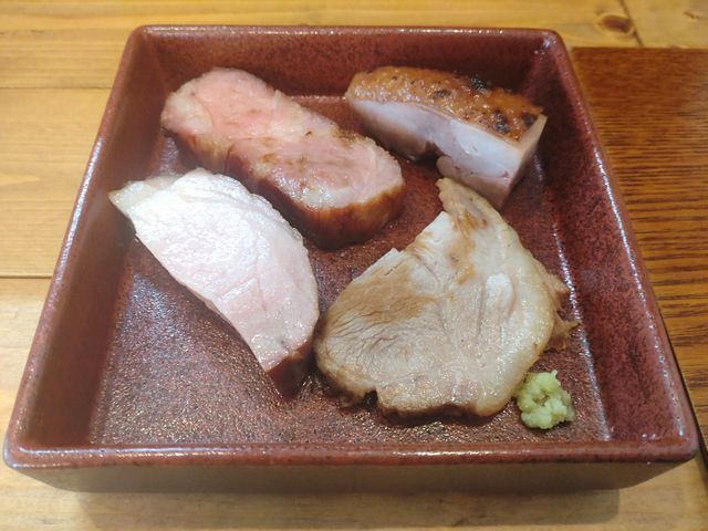 この日、一杯目に「FeelThe出汁かけ塩らぁ麺」と鹿児島県産地鶏の一つである「黒さつま鶏『黒王』」のローストチャーシューに豚肩ロースの煮豚、豚シキンボのレアチャーシュー、豚肩ロースの低温調理して燻製したスモークレアチャーシューの4種のチャーシューが盛り合わされた「チャーシュー盛り」をいただいた。