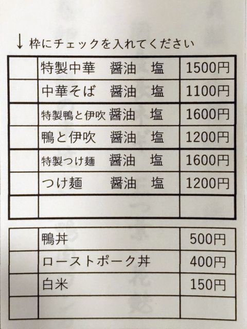 メニュー:特製中華そば(醤油)…1500円/中華そば(醤油)…1100円