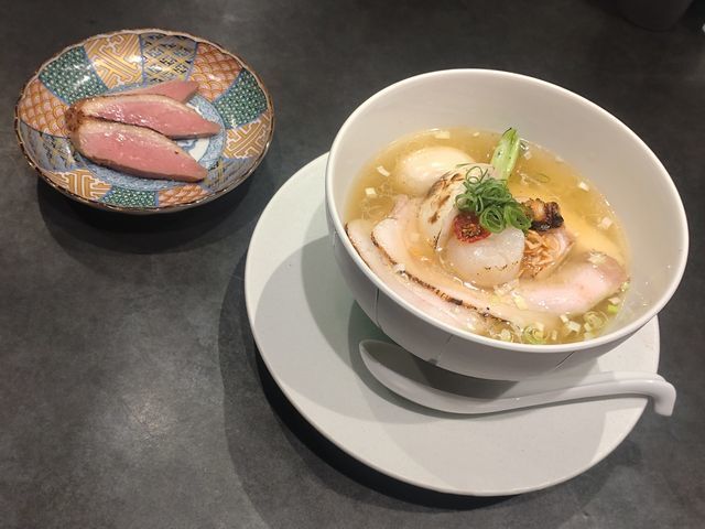 味玉、炙りホタテ、ローストトマト、九条ネギ、フライドエシャロットが盛りつけられた美しいビジュアルの塩ラーメン✨️