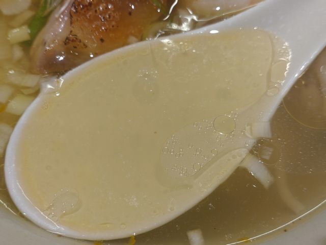 そうして、供された「Rich塩らぁめん」は、豚肩ロースの焼豚に鶏もも肉のロースト、炙ったホタテの貝柱、てるてる坊主型の肉ワンタン、ハーフ味玉、筍、アスパラガス、ほうれん草、芽ネギがラーメン丼の半分を覆うように盛りつけられて!