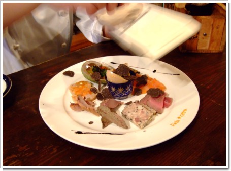 これはオードブル盛り合わせにしてもらいました。皿にざくざくとトリュフを散りばめてもらって。
