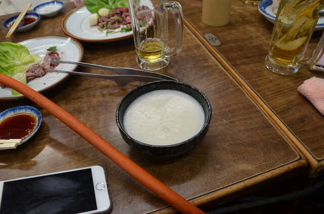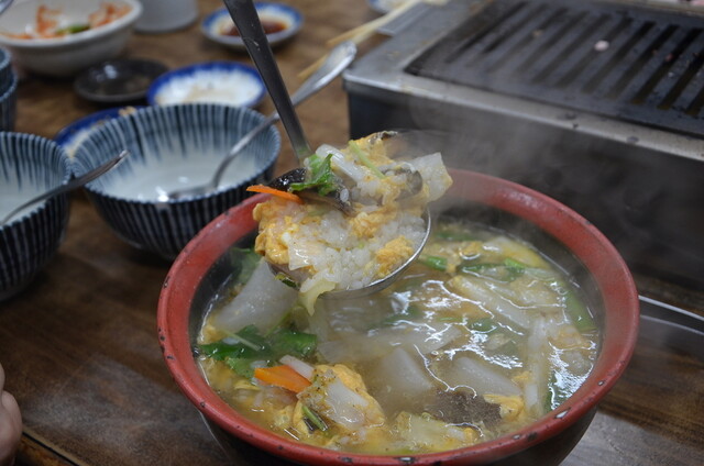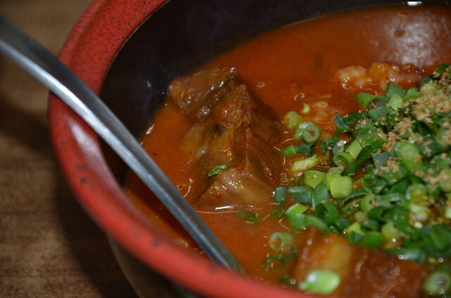 テグタンは、柔らかくなった牛スジ肉入りのトロミのある甘辛クッパ。辛さはかなり控えめ。