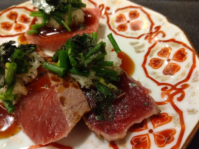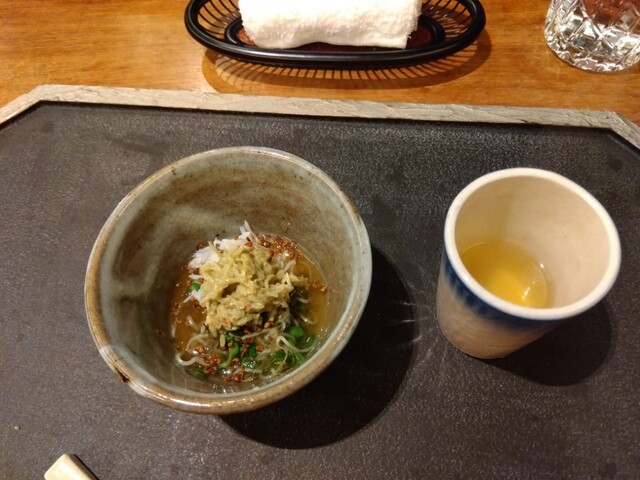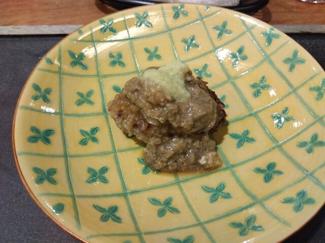 —上には辛味大根、ネギ、海苔が乗っています。行者ニンニクを醤油に漬け込んでくずで溶いたソースがかかっています。