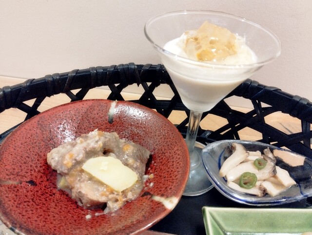 銀杏もち、蓮根のガレット、マッシュルームプリン、かぶの南蛮漬けという見た事もないメニュー、予想の斜め上どころか真裏に飛ばされます。