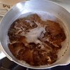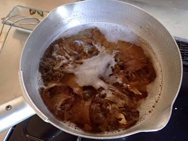 火を止め少し落着かせてから出汁殻を漉上げ,酒半カップと塩で調味.