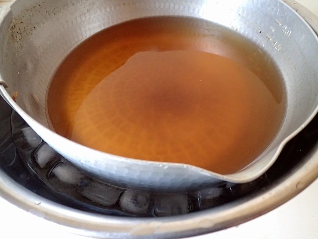 さっと沸かして香り程度の醤油を落し,荒熱が取れたら氷煎しておく.