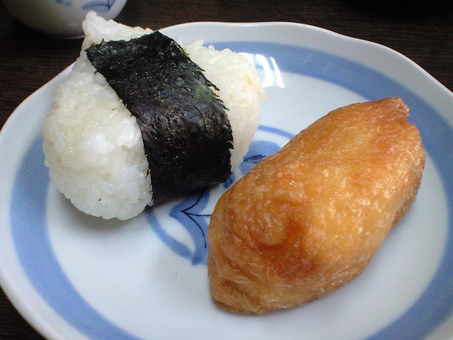 おにぎり(昆布)とお稲荷さん;昆布が切れていたのでとーさんが握ってくれました (^^) @2013/04/13