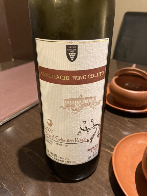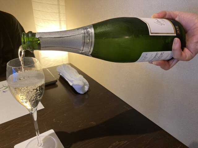 ヌーベルシノアだけあって合わせるお酒はワイン。今回はボトルでスパークリングワインとオレンジワイン。飲み過ぎ?(笑)ワインはシェフの出身地である山形県米沢市のものをメインに揃えてあります。