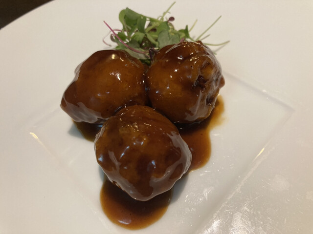 次に出された酢豚、ミートボールかと思ったら中はシャインマスカットが!!(◎_◎;)