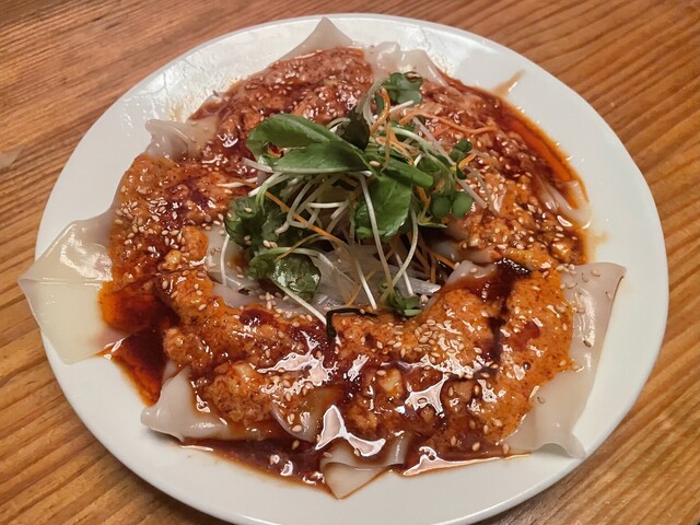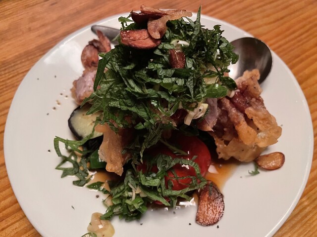 なお、店名の16ミリは、名物である自家製腸詰に使う豚肉を挽くミンサーの直径が由来だそうだ。で、その腸詰。熟成された粗挽きの肉と脂とスパイスの融合が見事で、ゆっくり噛み締めると本当に美味しい。ピータン豆腐はピータン自体も美味いが、パクチーやトマトやソースも含めた全体としての味わいがとってもいい。ゴマダレも美味し過ぎて、棒棒鶏を頼んだのに、ゴマダレ雲呑も追加してしまった。同行者が異口同音に絶賛だったのが、厚切り豚唐揚げのにんにくソース。カリっと揚げられた豚肉に、素揚げされた茄子や薬味の大葉とあっさりめのにんにくソースが絶妙。肉料理が中心だが、まあ何を食べても間違いない。