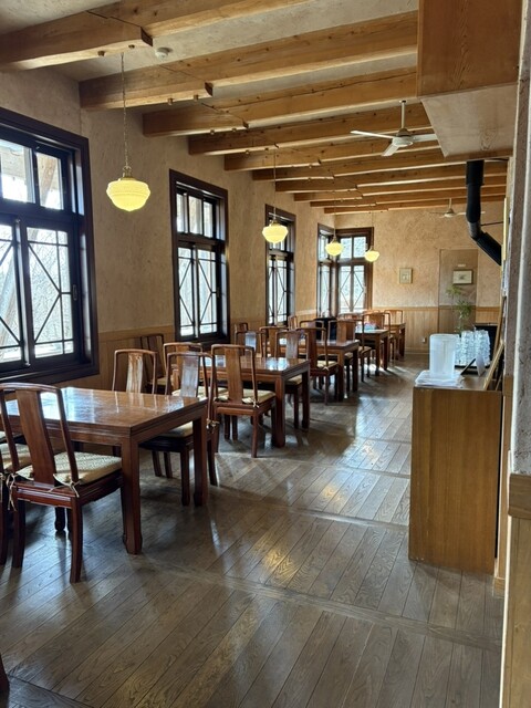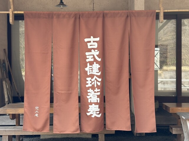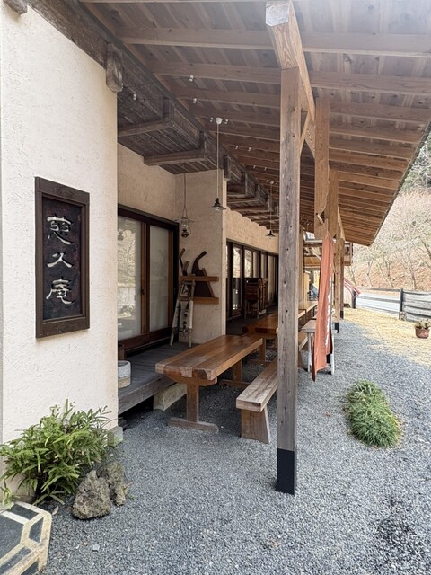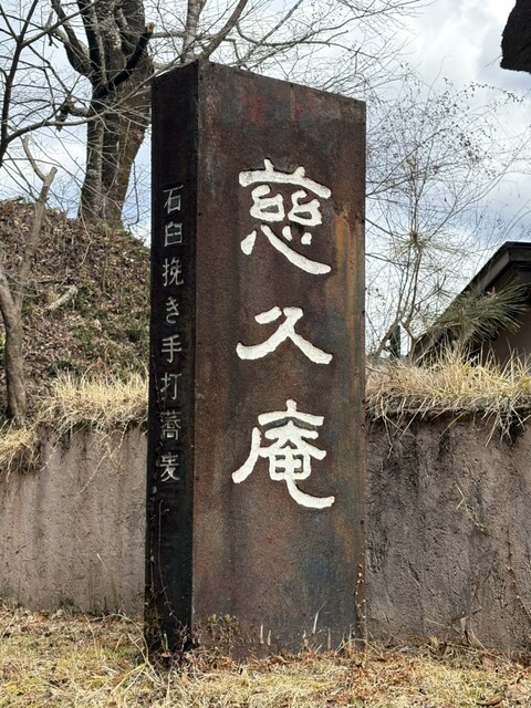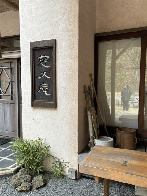 常陸秋そばの名店、長蛇の列との口コミを見て平日の早朝に出発して早めの1045に到着。茅葺きながら欧州風のデザインでワンオペとは思えない大きな店構え。居抜きなのかと思えば店主のデザインなのだそうです。店内の調度も木材が基調ながらも洋式のモダンなデザインのものが組み合わされていて独特な居心地を演出してます。
