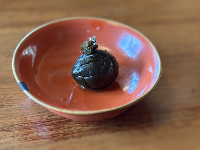 噛むとほのかに香る蕎麦の香り、野菜の天ぷらも聞いたことのない珍しい野草類でした。デザートの梅も13年?漬けてあり、自家栽培の烏龍茶が添えてある、とのご説明。