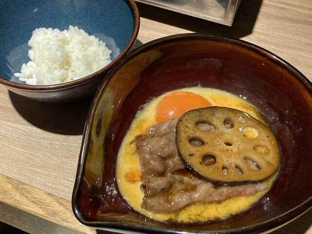 加賀野菜の蓮根と一緒に鍋焼きしてから割り下を絡めて卵にダイブ