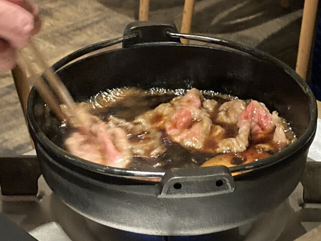 ロースターでの焼きを終え、霜降りサーロインすき焼き
