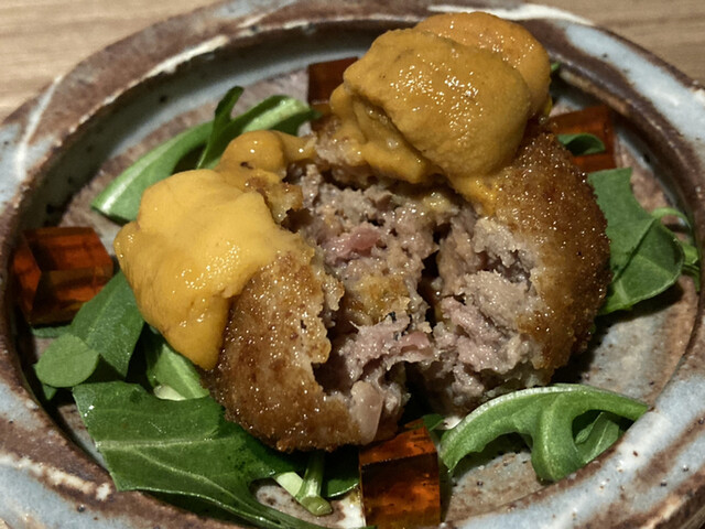 和牛を扱うお店だからこそ出来るメンチカツは雲丹乗せで贅沢