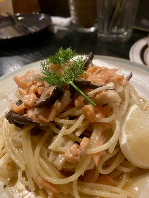 スモークサーモンときのこのレモンパスタ!サーモンとキノコ合うのね!レモン絞ってさっぱりと!!