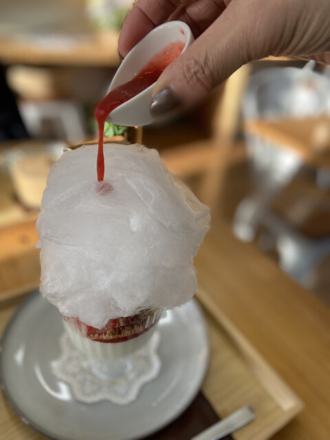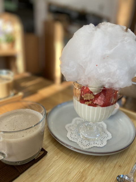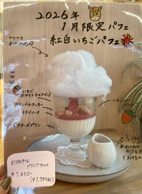 今月はわたあめが乗ったいちごパフェ♫