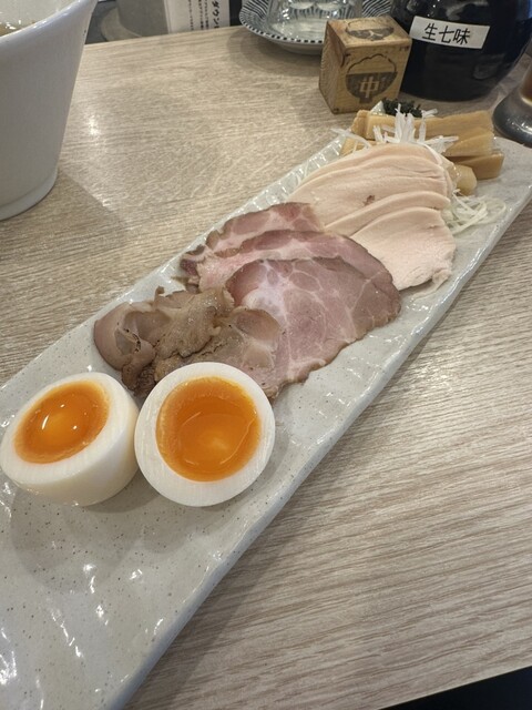 ・全トッピング(白ネギ、味玉、メンマ、レアチャーシュー、鶏チャーシュー、炙りチャーシュー)各100円