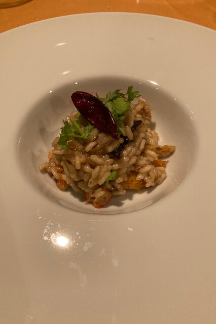 花咲蟹のリゾヤニ:花咲蟹で取ったダシで作った「リゾットとブロード」のハイブリッド料理、だからリゾヤニ。ボスいわく、ダシではなく(ギィでもなく)イタリア語で「ブロード」と言われていたがリゾット寄りだからかな。フュージョンでありながらも、そんなところに様式美を感じてしまう。お味のほうだが、蟹のエキスを吸い込んだ、しっかり芯を残した米が旨いのなんの。