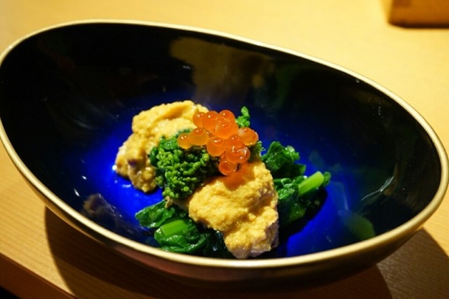 「菜の花のウニクリーム和え」は、ほんのり苦い菜の花に、ウニの風味がしっかりとするクリームがたっぷりかかっていました。