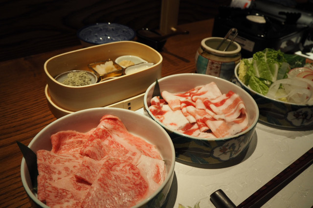 こだわりの出汁に野菜を入れたら、石垣牛やアグー豚をしゃぶしゃぶ。