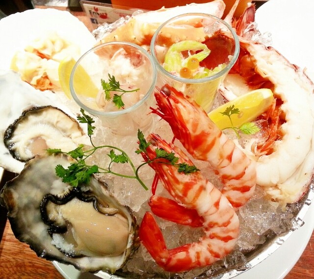 エニ's サンプラープレート4500円。牡蠣 、車海老 、オマール海老 、タラバガニ 、ホタテ 、赤えびとズワイ蟹のシューター 。。。シーフードがてんこ盛りなんです!カクテルソースにタバスコ、レモンでさっぱりいただくのが好きです~~(⌒‐⌒)