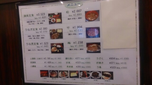 メニューですが、基本的にうなぎのみ。定食系のメニューは、う巻きやうざく、肝煮が付いてたりしますが、丼系のメニューは肝吸いと漬け物のみという感じ。お店の人に聞いたら、うなぎ定食のうなぎの量と、うな丼の梅のうなぎの量はほぼ一緒とのこと。とにかくうなぎが食べたいなら、うな丼から選ぶのが良いかと思います。