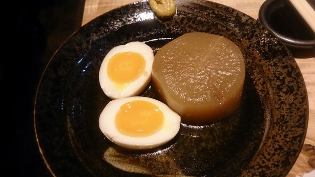 次に、この店のもう一つの目玉であるおでんを。写真には大根と玉子しかありませんが、牛すじも頼みました。立ち飲みのほうにも、数は少ないながら置いているのですが、やっぱりこちらのほうが本格的な気がしました。