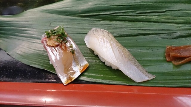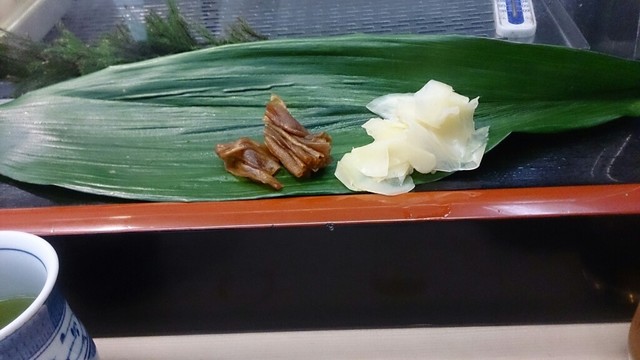 まずは、何かの葉っぱの上に大量のがりとかんぴょうが置かれました。がりは無着色のもの。かんぴょうは、巻きずしの中に入ってるような甘辛く、柔らかく炊かれたもので、これらが突き出しのような形で出てくるのですけど、ちょっと面食らいました。がりは生姜の辛さがほどほどに効いていましたし、かんぴょうはそのまま食べても程よい食感で美味しかったです。
