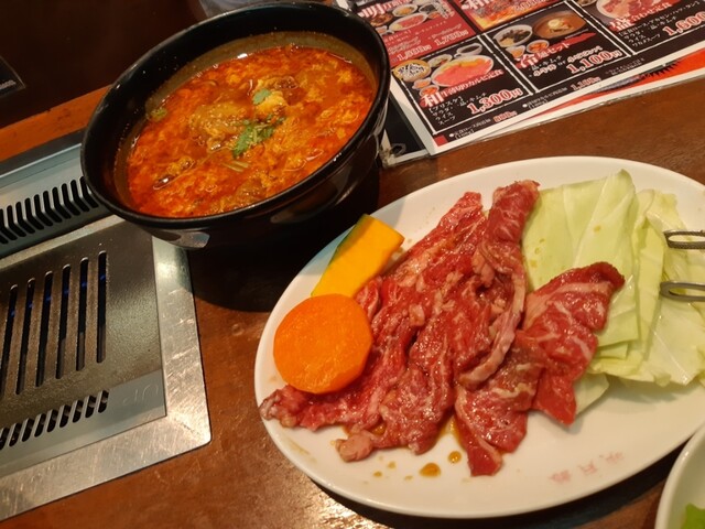 定食ロース肉は定食セットと同じくらいの量がありながら、カルビスープの中には、スジの部分が多いのかわかりませんけど、塊肉がゴロゴロ。わかめスープみたいなのではなく、がっつりなメインおかずスープで、韓国風ビーフシチュー的な感じかなと。肉は柔らかく煮込まれていますし、スープは甘辛の良いバランスで万人受けしますが、だからといって他所で食べられる味でもない気がしました。焼肉も少しで十分ですが、カルビスープだけでもご飯をおかわりできるくらいにはボリュームがありましたし、美味しかったです。