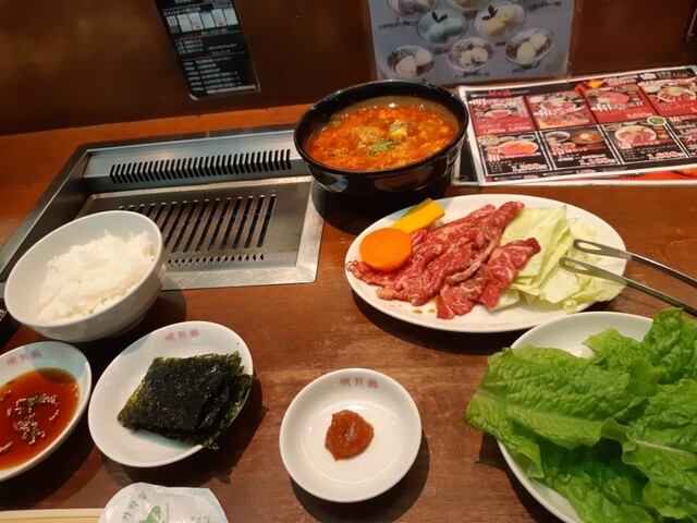 こちらは、定食ロース肉とカルビスープ、チシャ・辛味噌・韓国海苔に、ナムル・キムチ3種、そしてご飯というセットです。