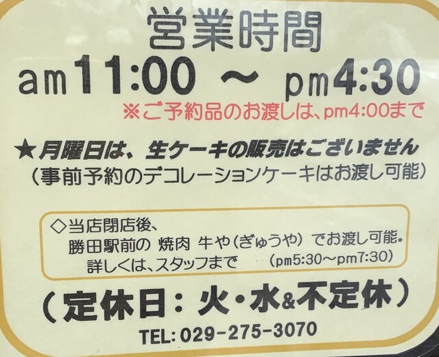 月曜…シュークリーム、マカロン、焼き菓子等のみ(事前予約すればホールケーキお渡し可能)