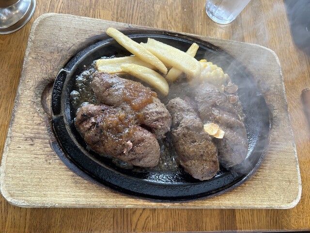 小振りながらも厚さ3cm程の厚切りステーキが3塊、玉ネギの上にのっています。