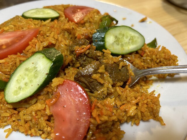 メニュー表に「ラムのインド風チャーハン」と書いてある通り、炒め式のビリヤニ。