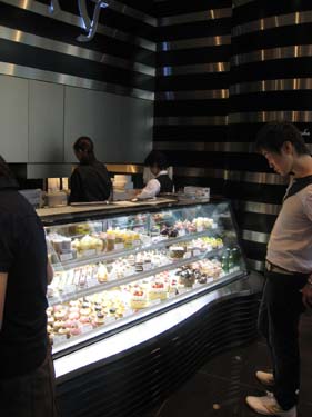 入って、右にはショーケースがあり、ケーキはこちらで。黒と銀の横縞の模様の壁がスタイリッシュな感じです。