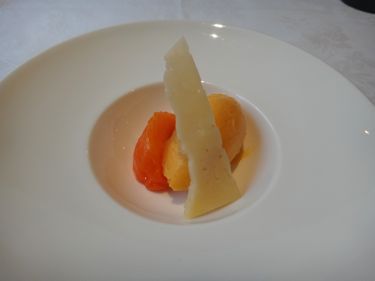 それになんとチーズです。イエサバルというチーズらしい。しっとりしていてチーズらしい旨味があります。林檎とチーズを合わせて食べるのだそうですが、それを元に柿で再現。これが意外にあいますね〜。