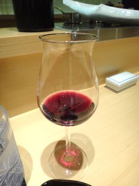 最初に出されるのは木イチゴの香りのする65%カカオのチョコレート。これをを口に含み、噛みごたえある鶏のエンガワを食べてソースのようにコーティングされたところで、赤ワインで喉に流し込む。