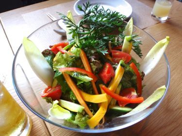 大きなガラスのボウルのような皿にたっぷりと彩り鮮やかなサラダが。葉付きの二十日人参、黄色いズッキーニ、チコリ、懲りんキー、レタス、ホウレンソウ、キュウリに甘いトマト、茹でてあるブロッコリーです。