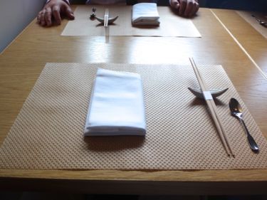 木のテーブルの上にはランチョンマットと白いナプキン。天井からは大きな裸電球がぶら下げられており、テーブルに一つ、持ってきてくださいました。
