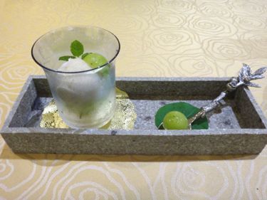 そのスプーンが空いたら左のグラスを楽しみます。いちばん下にはシャインマスカットを中に閉じ込めた白餡の水饅頭、その上にプリプリ食感の柚子の泡、それにシャインマスカットのシャーベット、シャインマスカットそのものです。