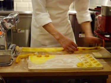 塩と卵黄で練り上げて広げた平たいパスタにとっておきカボチャのムースを乗せて包み切ったトルテッリ。
