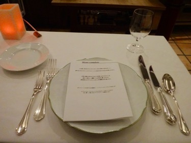 中はすぐに厨房です。タイル張りのその場所に横に3つテーブルが並べられていて、6人だけが一晩幸せな時間を過ごせるという趣向。