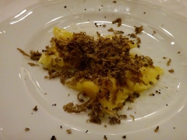 溶かしたバターのソースで、上にたっぷりと削りかけたサマートリュフ。下にはペコリーノチーズかな?