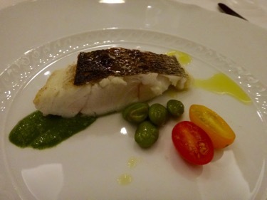 備長炭で焼かれていましたが、その皮はパリッと絶妙、その白身は凝縮された旨みを味わえるしっとりした口当たり。スズキを寝かせて使っているそうです。かけられているのはトスカーナのオリーブオイル。それにバジルのソースです。