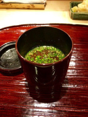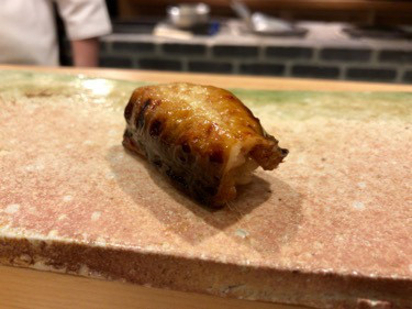 上には「さいとう」や先日の「渥美」でも採用されたアサツキのペースト。アサツキをあたり鉢であて生姜を混ぜているのだそう。。そこに香ばしい白胡麻。