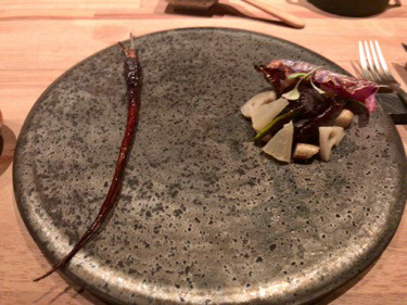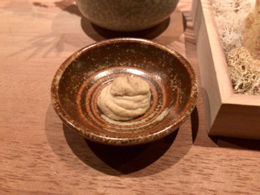 手前には天然きのこを3ヶ月発酵させたディップ。不思議な酸味があり、昔懐かしいモデラー時代によく嗅いだような爽快な香りがスーッと口の中を抜けて行く。時期によって使うキノコが違い、色も味わいも違うのだそう。この日のきのこはクリタケ、マイタケ、シメジなど。
