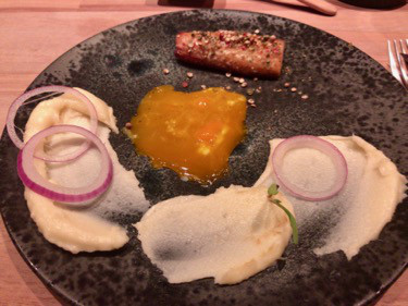 黒い皿に鯖のスモーク。上には十種以上のスパイス。美味いがスパイスも効いている分、結構きつい。
